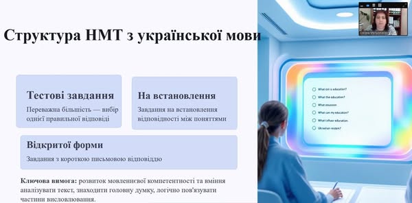 Оксана Георгіївна Мельниченко, консультант Центру, окреслила актуальні тенденції НМТ, наголосила на типових труднощах учнів і визначила ключові напрями методичної підтримки вчителів.