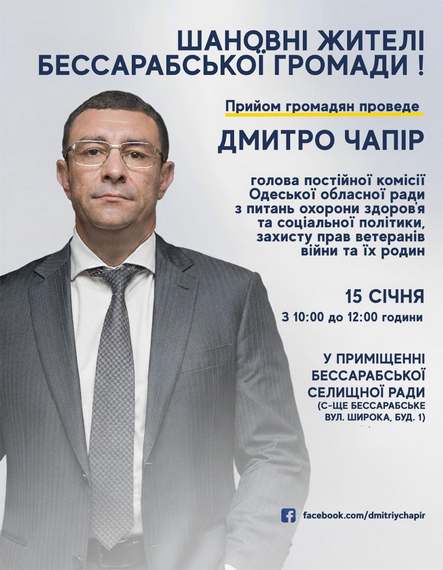 Попередній запис на прийом проводиться за телефоном секретаря виконкому Бессарабської селищної ради Олени Михайлівни Абрамової 067-199-7676.