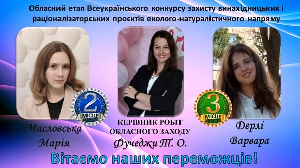 · Диплом III ступеня — Дерлі Варвара (7 клас, Бессарабський ліцей). Проєкт: «Проблема сміттєзвалищ у моєму селищі та шляхи її вирішення».